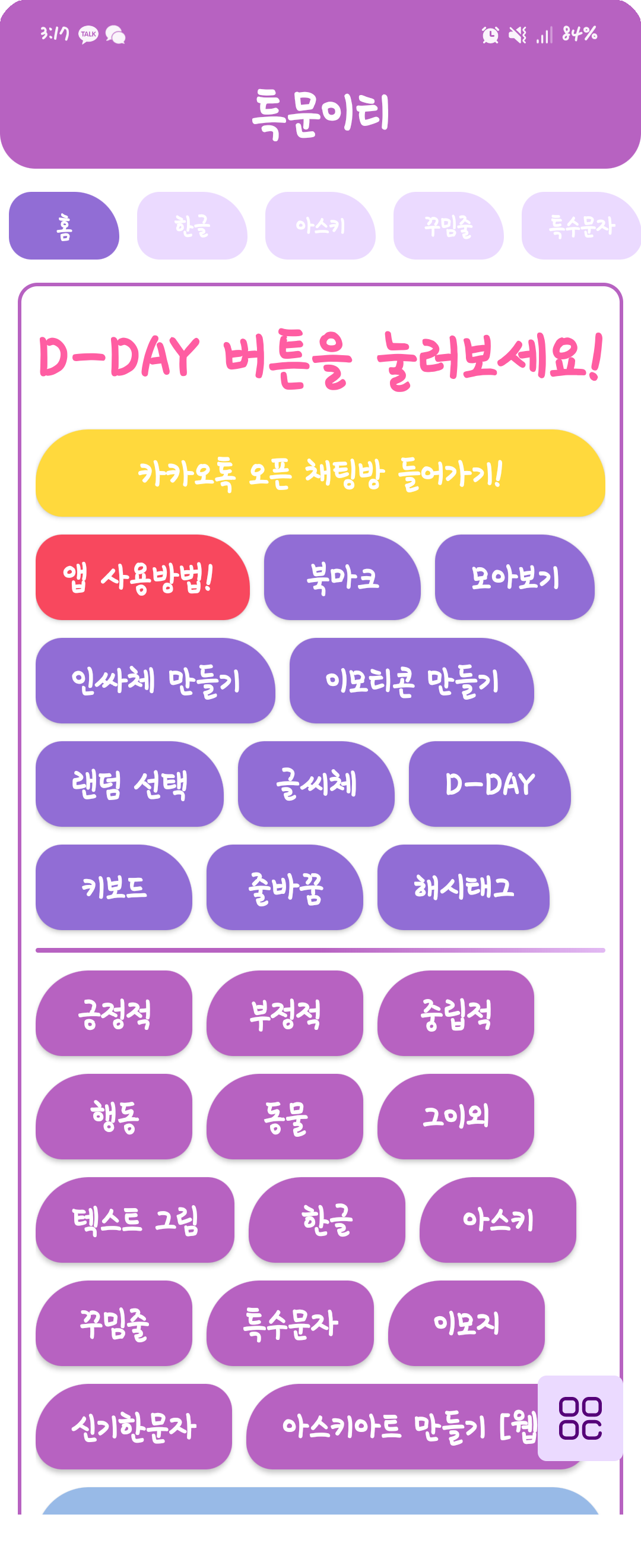 12300개 이상의 특수문자 이모티콘과 인스타 편의기능, 이모지 등이 한 앱에! 전면광고가 없어 이용하기 편해요!